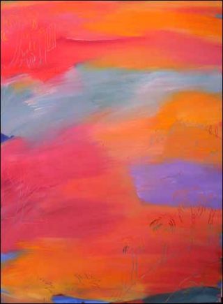 Baignés dans une facture picturale aux teintes évoquant des lumières crépusculaires ou des couchers de soleil, les paysages perdent leur articulation spatiale, et s’étalent sous nos yeux en un continuum coloré ininterrompu qui invite le spectateur à s’y perdre. La grandeur des formats favorise cette immersion dans le champ coloré.