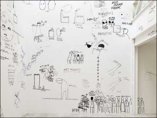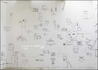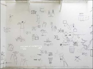 La force de Dan Perjovschi est d’avoir transposé ses doutes et son rire dans l’univers de l’art contemporain, pas toujours prompt à recevoir l’actualité du monde sans l’essorage d’un traitement archivistique. Car s’il dessine généralement ses idées sur des carnets, il les concrétise réellement sur les murs des galeries qui l’invitent.