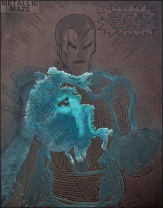 Mes derniers Mazes font directement référence aux «oxydations» d’Andy Warhol. J’ai d’abord enduit les toiles d’un apprêt à base de cuivre ou d’autres pigments métalliques avant de sérigraphier sur elles les structures de labyrinthe.