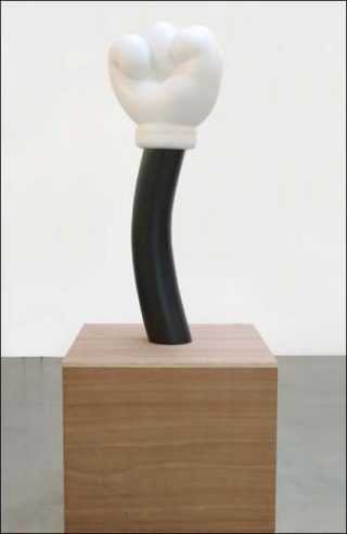 Le bras noir, ganté de blanc, de Mickey Mouse surgit d’un socle en bois. D’ordinaire plutôt amène, la main de la mascotte de Disney arbore ici un poing levé, serré, en signe d’ingérence et de ralliement des causes d’extrême gauche. Kinky Afro se nomme ironiquement l’œuvre, référence à un titre du groupe de rock Happy Mondays, réputé pour ses dérives et ses débauches…