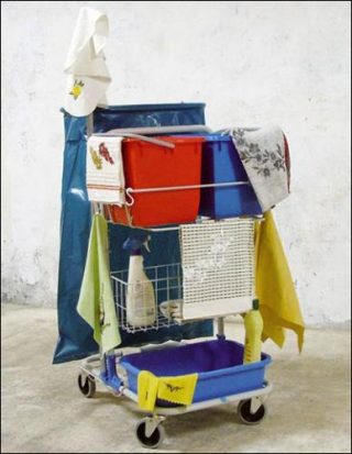 L’œuvre de Pascale Mijares fonctionne sur le mode du transfert. Composée d’un chariot à ménage équipé de ses produits d’entretien et de ses ustensiles de nettoyage, l’œuvre se distingue pourtant d’un chariot à ménage traditionnel. La différence tient au fait que chiffons, serpillère, gants et peau de chamois, disposés sur le chariot ont été «customisés» à l’aide de broderies ou de transferts. Dans Ma mob, Pascale Mijares réconcilie fonction et paraître. Ces signes décoratifs permettent d’attirer le regard sur une profession déclassée, de faire réapparaître les invisibles de la société.