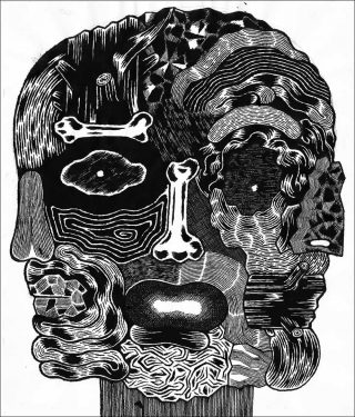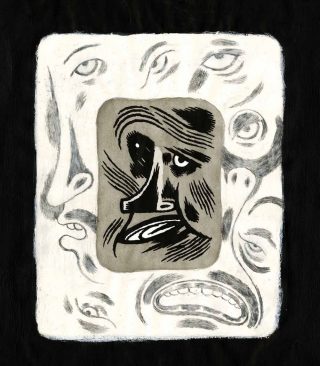 Le Roi du Monde, figure mythique universelle, est espéré par David B. comme un être doué d’immenses pouvoir : celui de guérir les blessures et d’abolir les souffrances, celui de ramener lumière et vie dans des lieux qu’elles ont désertés… Si le livre décevra ces attentes et ne fera qu’épaissir le mystère existentiel, il laissera à David B. la vision d’une figure à laquelle il attribue de multiples visages, toujours changeants. Trente-six des dessins composant la série sont quelques uns de ces visages. Les portraits en noir et blanc tiennent à la fois de figures monstrueuses, d’évocations de la mort personnifiée et de masques rituels africains ou océaniens. Les trente-six autres dessins représentent le frère de David B. qui, rapidement, eut l’idée d’évoquer par le dessin chaque crise du premier et la transformation progressive de son visage sous l’effet de l’épilepsie.