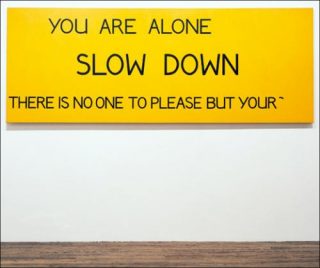 Adam McEwen aborde ensuite la question des drogues et leur utilisation à des fins de création. Source de désinhibition chez le surréaliste Henri Michaux, la drogue peut aussi devenir un matériau artistique, avec la Montagne de cocaïne de Georg Herold et le casque de moto réalisé en cigarettes par Sarah Lucas. Cette thématique a le mérite de soulever la question du scandale et de la liberté de l’artiste: comment créer librement et s’inscrire dans la société, dans son marché et ses conventions sociales? Les Å“uvres rassemblées ici se caractérisent par une liberté totale de tons et de styles, à l’image de cette phrase peinte inachevée de Jonathan Borofsky: You are alone. Slow down. There is no one to please but your(self).