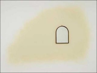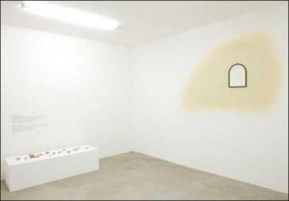 Sur le mur s’étale une tache de couleur pastel, large et diffuse: matérialisation d’un temps suspendu, trace vaporeuse du souvenir, dont la teinte particulière (vert pomme pour la table, rose chair pour le miroir) vient contaminer la blancheur neutre de la galerie.