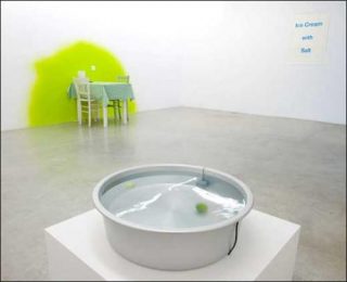 Mais ces avatars de vanités échappent à toute perspective tragique ou mystique; et les propositions décalées de Shimabuku résonnent d’une discrète jubilation. Ses photos et ses installations en forme d’énigmes zen développent une gastronomie de l’absurde, jouant de rapprochements antinomiques (l’affiche sérigraphiée Ice Cream With Salt), de distinctions subtiles (Kaki and Tomato) ou de juxtapositions incongrues (la photographie d’une Tangerine tombée sur un sol couvert de neige).