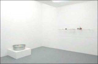 Un temps clos semblable s’écoule dans l’installation redoublée de Shimabuku, Something to Float / Something to Sink: deux citrons effectuent un mouvement perpétuel et circulaire dans une bassine remplie d’eau, l’un en surface, l’autre frôlant le fond. Comme l’étagère, la table ou le miroir de Pierre Joseph, les deux bassines de Shimabuku matérialisent via les objets les plus banals un temps atone, comme frappé d’inertie, et dans lequel l’humain semble s’être résorbé.