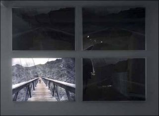 A l’entrée, quatre caissons lumineux de taille égale illuminent la photographie d’un pont suspendu sur lequel un ouvrier moustachu avance. Plans fixes uniquement modifiés par les quatre étapes d’avancement vers l’objectif dudit moustachu sur ladite suspension: loin, moins loin, un peu plus près, près.