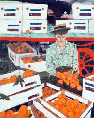 Le plus souvent pour ne pas dire toujours, Hernan Bas détourne les titres et sujets de ses œuvres à force de jeux de mots et allusions homosexuelles. Dans certaines des peintures exposées ici comme par exemple Odd Fruit, un vendeur d’oranges assis derrière ses étals débordants, le terme «fruit» renvoie non sans humour à la fois aux personnages et aux véritables fruits représentés avec eux dans des scènes bucoliques, la plupart desquelles tournent autour de loisirs liés à la saison de récoltes.