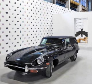 Il conduit une Jaguar noire de type E, que l’on retrouve exposée à la fin du parcours de «Fugu», et qui apparaît comme un drôle d’engin hybride dont le cockpit semble trop petit pour le pilote, de même que le coffre qui se trouve travesti en un corbillard pourtant trop réduit pour accueillir un corps défunt.