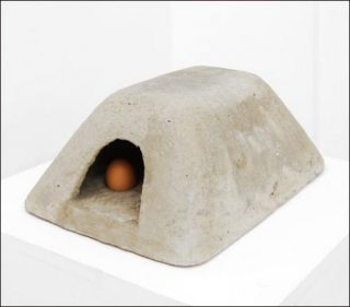 Bunker abrite quant à lui six œufs, à la manière d’une boîte en carton que l’on trouve dans tout commerce, sauf que l’abri est ici constitué de béton. Si la fragilité constitutive des œufs demande sans nul doute une certaine protection, afin qu’ils ne se brisent pas au premier choc survenu, le bunker de béton grossit le trait au point de nous renvoyer vers une critique des tendances sécuritaires qui agitent de manière irrationnelle nos sociétés.
