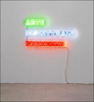 Le néon Western (E.A. tricolore italien) nous renvoie à l’histoire de l’art, et plus particulièrement à l’art conceptuel, vu que l’œuvre véhicule un message écrit («Arte conceptuel spaghetti»), par lequel François Curlet définit d’ailleurs sa propre pratique artistique. En effet, il s’inscrit dans le sillage du mouvement conceptuel, tout en déterritorialisant ses codes, à la manière du style cinématographique du western, qui a été repris et revu par Sergio Leone et les adeptes du «western spaghetti».
