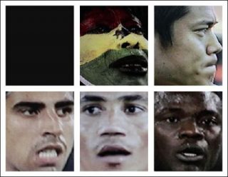 Les arrêts sur image s’apparentent à des prises de notes rapides de physionomies expressives, décontextualisées et assemblées pour créer une cartographie d’«émotions» possibles. Ainsi, paradoxalement, ces images consommées en direct par des milliards de téléspectateurs pour leur apparente immédiateté avec l’événement, se transforment instantanément en représentation palpitante. Le jeu d’équipe se réduit alors aux détails saisissants (yeux, nez, bouches), «peopliser» le spectacle pour gagner des parts d’audience.