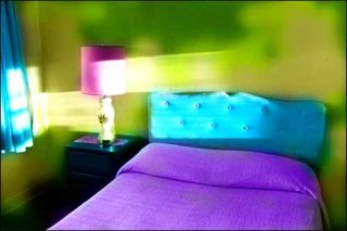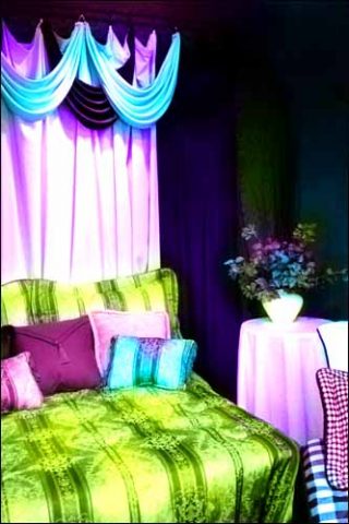 Derrière une tenture de velours rose, un long corridor obscur. Des chaises et des tables de jardin, un décor végétal spectralement redessiné par des UV de discothèque, invitent d’entrée à la pause. Un sas de décompression, en somme, pour se laver des bruits et des lumières de la ville. Puis un vaste patio, au parquet ciré, et à la luxuriance toute artificielle. Des feuillages qui diffractent multicolore un ciel blanc de lumière, des sous-bois roses magenta, comme des photos qui auraient mal vieilli, tapissent les murs. Là encore une table, des poufs, voilés de tissus crème, des ampoules UV, inopérantes dans la lumière, qui évoquent le décor d’un dancing désuet, et déserté.