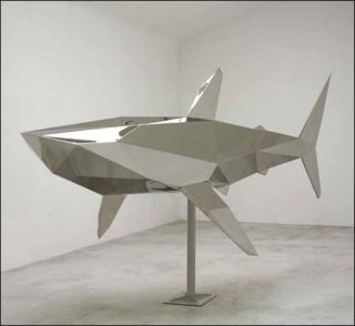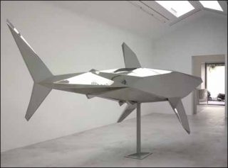 Xavier Veilhan expose un requin grandeur réelle. Sculpture en miroir, boule à facettes sur socle, le requin sur sa quille reflète l’espace autour de lui. On peut s’approcher, se mirer, regarder son reflet. Clou de l’exposition, il est au centre de tous les regards, de toutes les attentions. Sa réalisation n’est pas parfaite car ses nageoires ventrales ne passaient pas le seuil de la galerie. Le squale à facettes est promu à un avenir aussi singulier que le rhinocéros rouge trônant au Musée national d’art moderne de Paris. Dans les deux cas la référence animalière joue à fond, l’échelle un renforce la relation au spectateur.