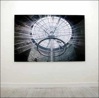 La taille monumentale des tirages contraste avec le choix fragmentaire du cadrage. Ce décalage confère une autonomie démesurée à des éléments d’architecture coupés de la structure à laquelle ils appartiennent, et qui leur assigne une fonction déterminée.