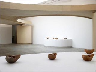 Pourtant, pas plus que la sculpture en bois n’accueille, à la différence de celle de Scarpa, sculptures, plantes et fontaine, les terres cuites façonnées chacune de la même façon à la main et appartenant à la série «Orthocenters» n’accueillent en leurs creux quelque contenu inattendu.