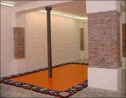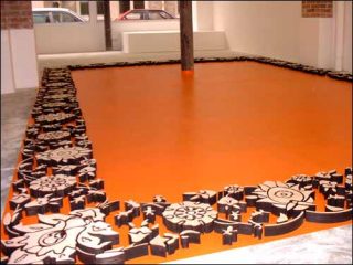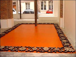 Rien devant nos yeux lorsque nous poussons la porte, c’est vers le sol qu’il faut regarder pour voir ce « tapis de galerie » composé d’une surface plastifiée orange et de pièces de bois qui, une fois assemblées, forment des éléments décoratifs. Cette frise de fleurs stylisées courant sur les côtés du rectangle coloré évoquent les traditions décoratrices maghrébines comme l’enluminure juive ancienne.