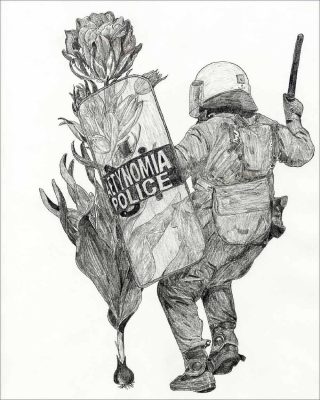 Face à cette Å“uvre, une série de dessins en noir et blanc figure des émeutiers ou des policiers se battant avec des tulipes géantes. Très dynamiques, d’une scénographie épurée, ces dessins montrent l’essence de la lutte, mais décalée, rendue absurde par la présence des tulipes. On ne la comprend qu’en se souvenant de la tulipomanie des collectionneurs hollandais du XVIIe siècle, souvent présentée comme la première explosion d’une bulle spéculative, symbolique des paradoxes du capitalisme.