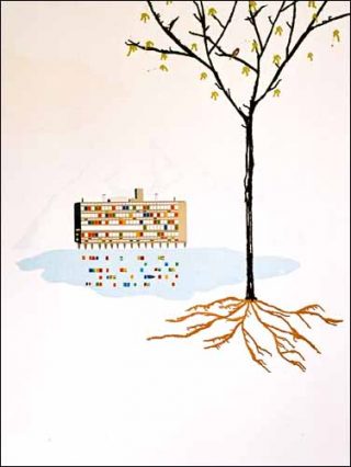 Malgré cette harmonie, la nature évolue de plus en plus et, comme l’architecture, devient un projet d’urbanisme, d’aération de la ville. La nature est comme encerclée par l’architecture. Les rôles s’inversent : on construisait des bâtiments à la place des arbres et on pense désormais la place des espaces verts dans des villes surchargées. Cette inversion s’exprime par la façon dont la nature est travaillée dans les œuvres de Drummond. Le hasard de feuilles ponctuant le tableau est certes présent, mais les arbres sont comme incrustés dans l’architecture, dotés d’une place bien définie. La géométrie du tableau, l’épuration des formes, font songer à un dessin d’urbaniste.