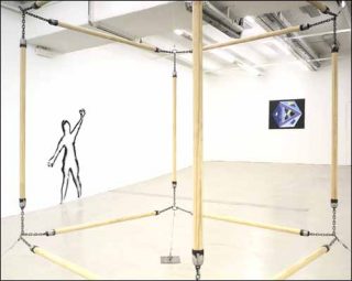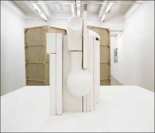 Pour l’occasion, sa proposition au Crédac consiste en quelques grands tableaux en vis-à -vis de volumes imposants, et répartis sur deux salles que l’on visite successivement dans ce qui apparaît comme une sorte d’enchaînement, de parcours. Face à face, côte à côte ou dos à dos, les œuvres se répondent dans une partition cependant inégale.