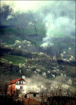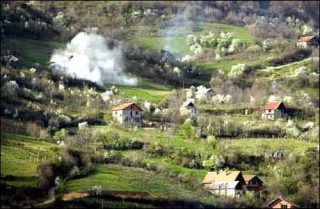 Gianni Motti présente à la galerie Jousse Entreprise une série de photographies de la guerre du Kosovo achetée à une agence de presse. Sur ces images qu’il intitule Dommages collatéraux, nous pouvons voir des paysages de montagnes ponctués de chalets d’où sortent des nuages de fumée. Toujours dans la même logique d’appropriation, il signe les actions qui figurent sur ces clichés. Destructions, bombardements, explosions, l’artiste semble tout pouvoir revendiquer. A une époque paranoïaque où les conspirations, même les plus farfelues, trouvent leur audience, c’est sa parole contre celle des médias.