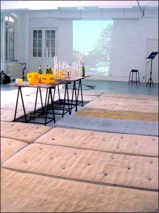 Dernière installation ou touche finale, juste avant le vernissage, Gianni Motti a saturé et neutralisé l’espace d’exposition à l’aide des matelas qui ont servi pour amortir les chutes au sol. Par ce geste, il met en scène le vernissage puisque les visiteurs doivent marcher sur cette improbable installation pour boire un verre. De plus, dans une ambiance aérienne d’hommes volants, il force le spectateur à évoluer sur une surface insolite et le place dans un espace où les lois de l’équilibre deviennent aléatoires; ça tangue !