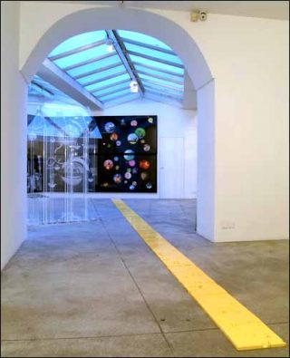 Invité à pénétrer les lieux en suivant la trajectoire rectiligne de La Conquête de l’espace, sorte de pont constitué de tranches de gruyère posées au sol à la manière de Carl André, le spectateur découvre un univers déroutant où formes, images et textes s’entrechoquent et se répondent hors des lois de la pesanteur.