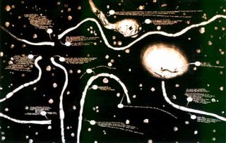 C’est à sa propre « aventure intérieure » que nous convie Le Prince des ventres à travers cette série de tableaux. Le dispositif mis en place s’avère un redoutable piège pour qui cherche la certitude. De fait la tâche ardue que s’impose l’artiste en peignant par le procédé de la réserve, se rejoue dans le désir désespéré du spectateur de lire chronologiquement les données dont il dispose (la feuille blanche est peinte à la gouache noire puis, au pinceau, l’artiste délimite minutieusement les contours des formes à venir, texte comme éléments visuels, ces derniers étant souvent travaillés en plus au lavis).