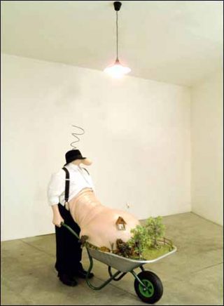 Seule dans une salle à gauche, la sculpture Le Prince des ventres annonce la couleur. Un personnage tout droit sorti du monde de la bande dessinée, et qui apparaissait déjà dans Les Parasites (2000), se tient debout. Son ventre, tellement volumineux, le condamne à pousser indéfiniment une brouette pour pouvoir marcher. De ce ventre, percé de fenêtres, émanent des bruits chaotiques qui peu à peu s’articulent jusqu’à former un semblant de langage.
