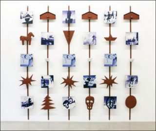 — Gina Pane, Voyage sentimental, Partition pour une tablette de chocolat, 1983-1984. 6 bars and 12 painted metal cut-outs, 15 phots, 3 earthenware bowls. 281 x 277 x 16 cm