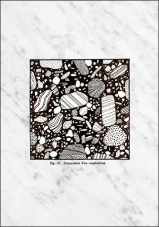 L’exposition «Gisement et Extraction» fonctionne comme un environnement qui explore différentes matières mais aussi leur représentation voire leur imitation. Ainsi, une sélection de peintures sur vieux papiers encadrées investit l’un des murs tandis qu’une peinture murale en trompe-l’œil d’un paysage composé de marbres de différents motifs et couleurs constitue le fond de ce gisement global.