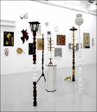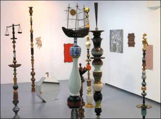 L’espace de la galerie est ainsi rythmé par des colonnes où l’on peut reconnaître des fragments de meubles, des potiches, des éléments de lampes, dont l’alignement vertical est surmonté par un objet pittoresque: mappemonde, navire à voiles, personnage de bois.