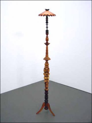 La démarche de cette artiste n’est pas sans évoquer l’Art brut. Ces œuvres réalisées avec des objets de rebut viennent chercher, dans notre inconscient, des rêves, parfois inquiétants, telle cette matière parcheminée comme une peau qui forme un abat-jour sans lampe, des associations, des fétiches, dont on comprend qu’ils hantaient déjà notre univers quotidien.