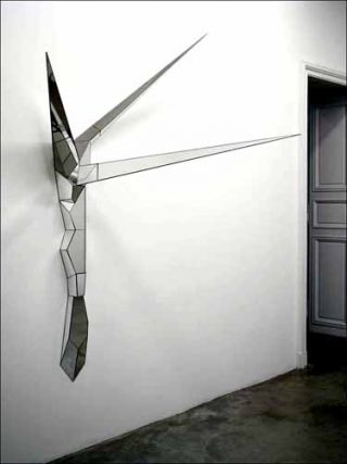Après la peinture aux mille ampoules, les sculptures aux mille facettes. Le même travail d’approfondissement et d’éclatement se retrouve dans ces miroirs ébranlés. Le long du mur des formes pointues, pareilles à des antennes d’insecte, descendent et dressent leurs pointes.
