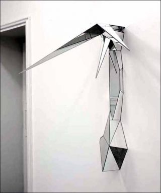 Ces sabres claires, aux nombreux contours, sont des serpents qui s’immiscent dans la pièce et prennent soin de maintenir le spectateur à distance. Hallebarde en branle, épée de Damoclès suspendue, ces pièces d’orfèvrerie sont des boucliers d’airain, polies à l’extrême, qui réfléchissent la salle d’exposition. Les écailles du miroir proposent au regard autant de facettes que d’angles différents. L’exploration passe par une multiplication des points de vue. L’expérience consiste à suivre à la trace ces boas carénés comme les navires de guerre furtifs. Mais loin d’être invisibles aux yeux des radars, ces diadèmes, mi-insectes mi-diamants, se donnent à voir en s’abandonnant dans des postures étirées.