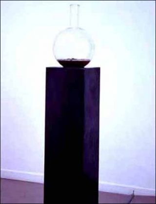 — La Soupe primitive de Stanley Miller, 2001. Socle en métal, fiole en verre, liquide.
