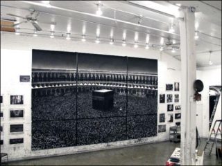 Dans une lumière tamisée, trois compositions monumentales au fusain surplombent le spectateur qui pénètre dans la salle principale de la galerie. En face, une vue de la Grande Mosquée de La Mecque, avec en son centre la Kaaba, cernée par des milliers de pèlerins. Sur la gauche, le Mur des Lamentations, avec ses pierres irrégulières et ses aspérités. À droite, la nef de la basilique Saint-Pierre de Rome, vertigineuse et rutilante. Les trois hauts lieux des grandes religions monothéistes cohabitent ainsi et se font face silencieusement dans une scénographie de sanctuaire.
