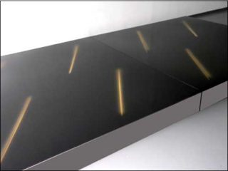 Et peut-être aussi de la mélancolie? Pas vraiment. Les ruines de Nicolas Moulin sont encore fumantes. Une mécanique inquiétante, envoûtante sourd de ses entrailles. Ce dont témoigne Zeitreisezusehen, cette plate-forme au coffre noir laqué d’où surgissent plusieurs foyers lumineux produits par des néons tournant comme des radars d’observation…