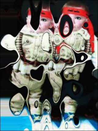 Enfin, l’installation Baby Terrorist de Mamali Shafahi reproduit et transforme progressivement, à travers une série de 49 images (7×7), une photo trouvée par l’armée Israélienne dans la maison d’un terroriste. L’artiste joue sur la dichotomie terreur / paix, sur le désir (ou le rêve) de changement, en Iran et ailleurs, et sur le symbole fort, dans diverses cultures, du chiffre sept.