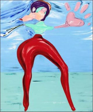 L’absurde a toujours été un ingrédient important de l’approche de Nicola Tyson: l’humour vire à la satire et souvent à l’hystérie. Dans Self-portrait: Weeping 2015, l’artiste fait référence à la «femme qui pleure» de Picasso, mais c’est ici sa propre expérience qu’elle décrit. Son nez semble cependant doubler de taille, tel un pénis éjaculant littéralement sur son visage. C’est souvent ce que ressentent les spectatrices face à l’histoire de l’art, mais derrière l’expression étonnée de Nicola Tyson se cache aussi un regard ferme, plein d’assurance et d’autorité artistique.