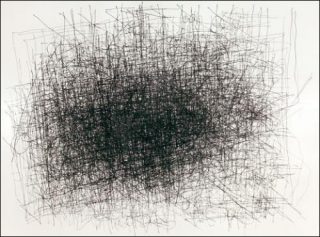 Pour rejoindre la question d’un débat qui a eu lieu à la galerie fin 2011, l’art brut qui nous est présenté ici semble manifestement soluble dans l’art contemporain. On ne peut s’empêcher de penser à l’art de Cy Twombly ou de Pollock, surtout devant les grands formats d’environ 1,50 m sur 2,50 m, qui impressionnent par leur maîtrise de l’équilibre. Le MoMa de New York a d’ailleurs acquis une œuvre de Dan Miller en 2008. Finalement, Dan Miller n’est ni plus ni moins obsessionnel qu’un Roman Opalka qui pendant cinquante ans a peint, toujours sur un même format, en blanc sur fond noir, une suite sans fin de nombres qui se succèdent.
