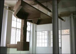 Les grandes sculptures en bois aggloméré de Sarah Fauguet et David Cousinard reprennent des éléments d’architecture métalliques, les poutres du plafond et les grilles des fenêtres extérieures. Aussi monumentales soient-elles, ces pièces s’intègrent pourtant au décor sans l’écraser. En reprenant les éléments du lieu comme un motif de travail, elles s’insèrent en lui et le prolongent.