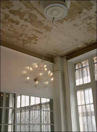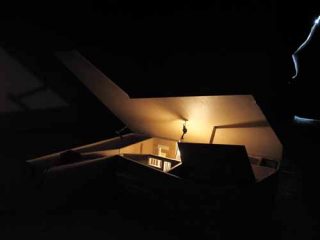 A cette menace au sol fait écho un bruit inquiétant, provoqué par le mouvement effréné d’un lustre suspendu. Lancé à folle allure quand on appuie sur l’interrupteur permettant de l’allumer, ce lustre suscite une peur bien réelle. Le sourire amusé s’efface un moment à l’idée que ce projectile pourrait s’effondrer: le guet-apens n’est peut-être pas si drôle.