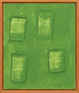 La série des « Grid Paintings » répond à la série fondatrice des « Grey Paintings » : on y retrouve le même motif de grille qui évoque celui de La Mort de Marat par Edvard Munch, cette fois en couleurs fauves. Cette démarche d’agrandissement/rétrécissement d’un motif connu est caractéristique des recherches picturales de Günther Förg. Son art appelle à la mémoire, mélange, reprend, change le format, fait dialoguer les disciplines, mais conserve la force expressive de l’original.