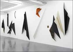 Dès lors, ses sculptures prennent une véritable densité physique et dramatique, aidées en cela par un travail de composition très précis qui fait s’entremêler la nature des différents matériaux. Les postures se font plus menaçantes, leurs rayonnements dans l’espace encore plus hypnotiques. Cette énergie contenue se déploie dans des lignes acérées, tendues, coupantes au point de sembler s’accrocher à la paroi.