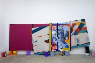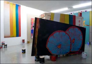 Juxtaposées le long des murs de la galerie, les toiles du binôme présentent des motifs similaires —quadrillages, bananes, noix de coco, bandes et point de couleurs—, dupliqués à l’infini via la technique de la sérigraphie. L’aspect sériel de ces tableaux, conjugué à l’absence de traces de pinceaux, les place du côté de la reproduction mécanique.