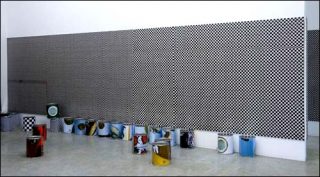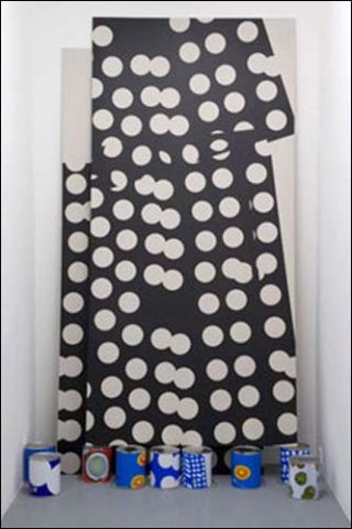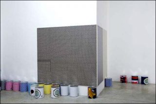 Cette dépersonnalisation se poursuit jusque dans le choix des motifs et des couleurs appliqués à la surface des toiles. Là où Andy Warhol maintenait la présence d’une individualité créatrice, GuytonWalker en éradique toute présence. Des dizaines de pots de peinture, ayant vraisemblablement servis à la réalisation des toiles exposées, jonchent le sol de la galerie. Sur chacun d’entre eux figure l’un des motifs visible sur les tableaux: bananes sur fond bleu, quadrillage noir et blanc, noix de coco sur fond rouge, etc. Évincée du processus technique aussi bien que de la sélection des motifs, la personnalité créatrice est définitivement absente des toiles de GuytonWalker.