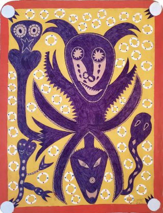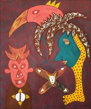 Ces tableaux vivement colorés, aux formes nettes et tranchées, où la peinture acrylique s’affine parfois de motifs au stylo-bille, évoquent des portraits mythologiques, sortes d’icônes métissées de vaudou et de christianisme. Ils se lisent dans les deux sens : comme une manifestation des esprits dans le monde des hommes, et comme un exorcisme, pour libérer la charge spirituelle partout présente.
