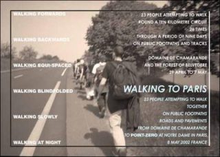 Hamish Fulton. C’est très important qu’une manifestation bloque les voies d’accès. Manifester oblige à marcher, à envahir la chaussée, c’est très intéressant à observer. Seule la tête du cortège représente la foule amassée. Les cinq leaders placés en prou symbolisent tous les autres. Les sociologues ont observé que les sans-abris marchent constamment. Ils font croire qu’ils vont quelque part alors qu’ils tournent en rond. Ils marchent vite pour donner cette impression.
