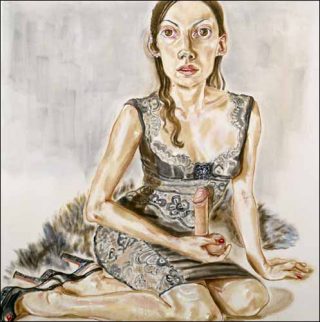 L’autoportrait de style néo-expressionniste dans lequel Ann Dhong pose assise de face avec un sexe d’homme dans la main, traite du dépassement de ces limites, ainsi que du narcissisme et de la fascination. La neutralité de son visage, sa presque indifférence, contraste avec la violence d’un geste suffisamment équivoque pour suggérer une émasculation.